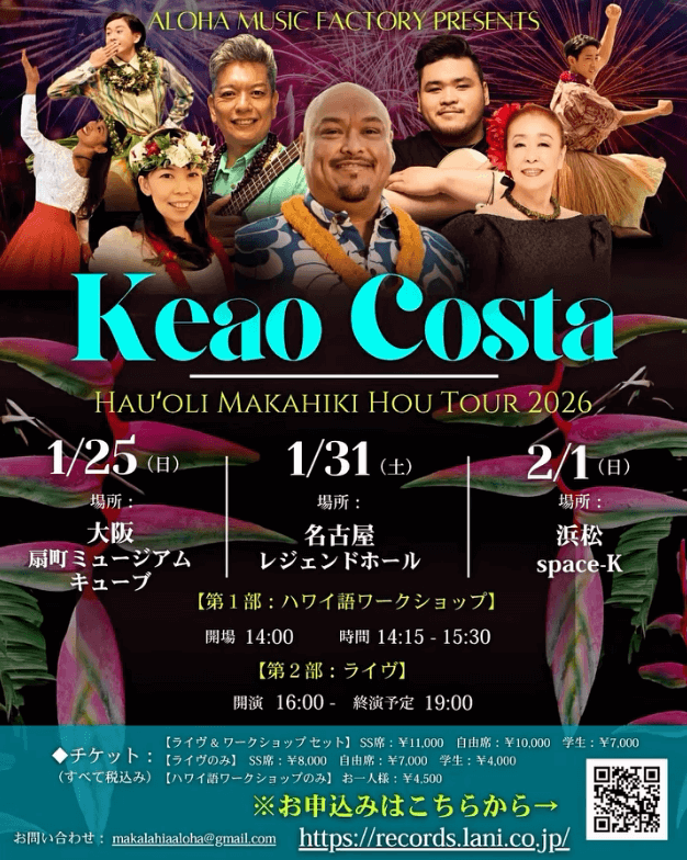【Keao Costa 新春ツアー2026】大阪公演 公式チケット¥4,000 – ¥11,000 チケット種別 選択してくださいライブ+WS セット SS席ライブ+WS セット 自由席ライブ+WS セット 学生ライブのみ SS席ライブのみ 自由席ライブのみ 学生WSのみクリア 【Keao Costa 新春ツアー2026】大阪公演 公式チケット個 カートに追加 商品コード: 該当なし カテゴリー: イベント 追加情報 レビュー (0) 追加情報 チケット種別 ライブ+WS セット SS席, ライブ+WS セット 自由席, ライブ+WS セット 学生, ライブのみ SS席, ライブのみ 自由席, ライブのみ 学生, WSのみ レビュー レビューはまだありません。 “【Keao Costa 新春ツアー2026】大阪公演 公式チケット” の口コミを投稿します コメントをキャンセルメールアドレスが公開されることはありません。 ※ が付いている欄は必須項目です評価 * 評価… 最高 良好 平均 良くない 悪い レビュー *名前 * メール * 次回のコメントで使用するためブラウザーに自分の名前、メールアドレス、サイトを保存する。 関連商品 【Keao Costa 新春ツアー2026】 浜松公演 公式チケット ¥4,000 – ¥11,000 カートに追加 この商品には複数のバリエーションがあります。 オプションは商品ページから選択できます 【Keao Costa 新春ツアー2026】名古屋公演 公式チケット ¥4,000 – ¥11,000 カートに追加 この商品には複数のバリエーションがあります。 オプションは商品ページから選択できます Aloha Music Facotry with KEAO COSTA【10月19日(日)名古屋公演】 ¥3,000 – ¥9,000(AMF x Lani FC会員価格: ¥2,000 – ¥8,000) カートに追加 この商品には複数のバリエーションがあります。 オプションは商品ページから選択できます AMF & KAULANA Melekalikimaka Tour 2025【11/22 横浜公演】 ¥2,500 – ¥6,000 カートに追加 この商品には複数のバリエーションがあります。 オプションは商品ページから選択できます